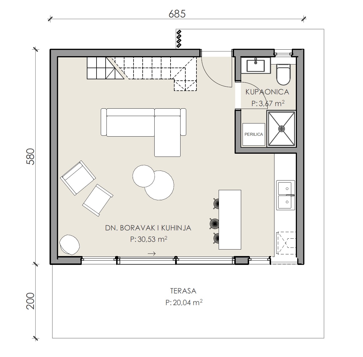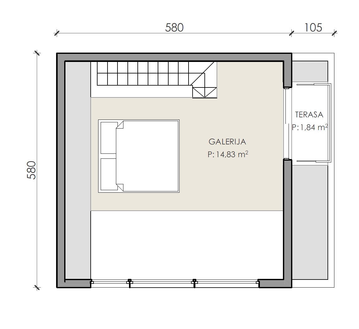 Kompaktna, ali izuzetno funkcionalna kuća s jednom spavaćom galerijom, kupaonicom, kuhinjom s blagovaonicom i svijetlim dnevnim boravkom. Velike staklene površine povezuju unutrašnjost s dvije terase i prekrasnim prirodnim okruženjem. Idealna za vikendicu ili život u prirodi – udobnost i moderan dizajn na jednom mjestu.