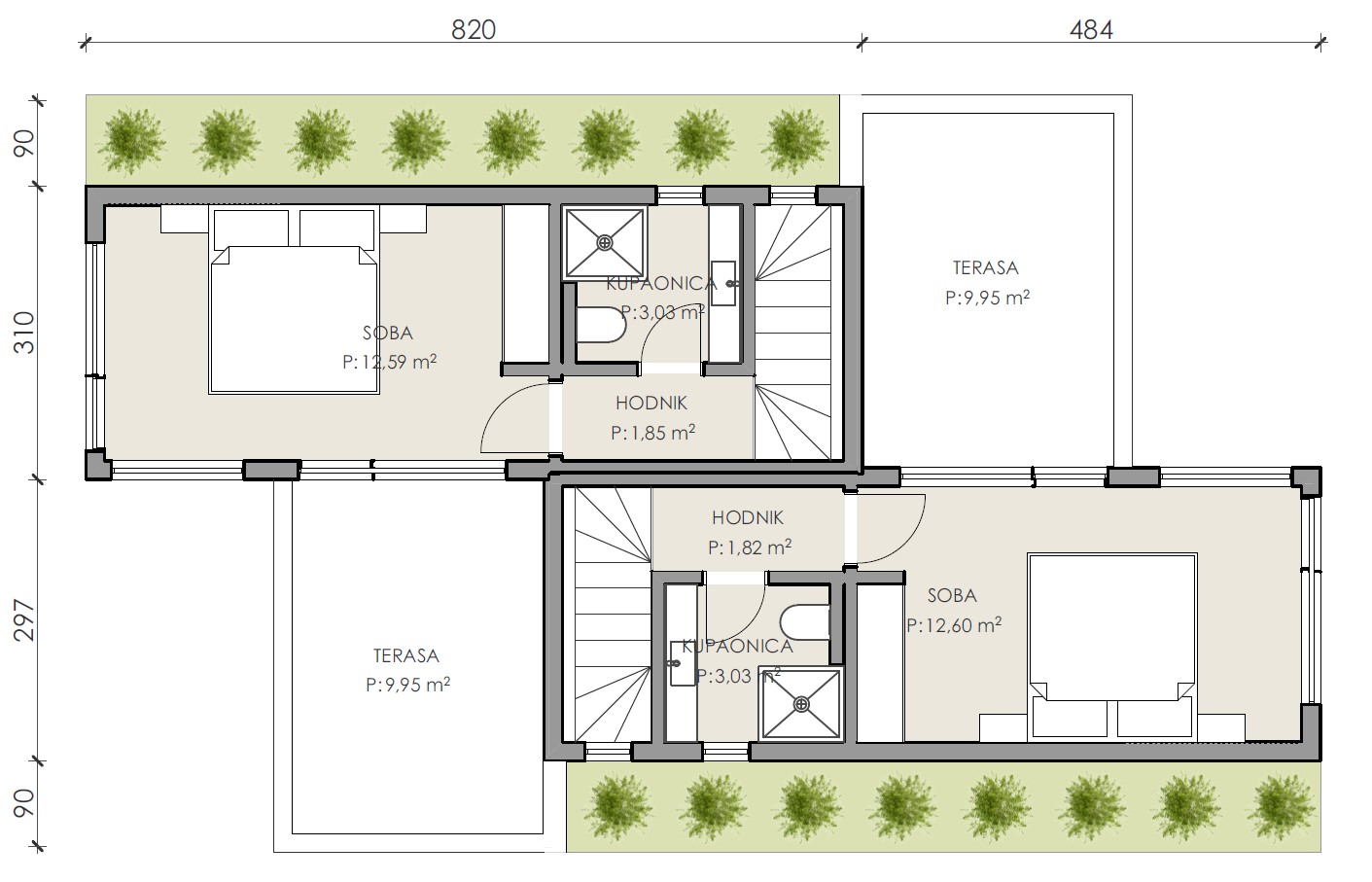 Ova moderno oblikovana kuća s dvije etaže po 49,50 m² kombinira suvremeni dizajn i funkcionalan raspored. Sadrži jednu spavaću sobu, kupaonicu i dodatni WC, prostranu kuhinju s blagovaonicom te udoban dnevni boravak s puno prirodnog svjetla. Dvije terase pružaju prostor za opuštanje na otvorenom, dok arhitektonska rješenja i estetski detalji ovu kuću čine savršenim domom za moderan stil života.
