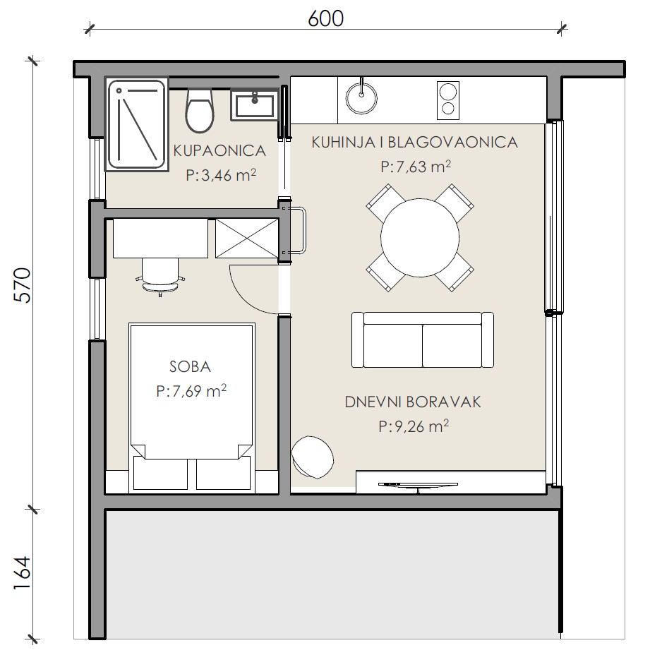 Ova moderno dizajnirana kućica unikatnog kosog krova i velikih staklenih površina nudi izniman ugođaj na samo 28,50 m². Sadrži dvije spavaće sobe, kupaonicu, kuhinju s blagovaonicom te dnevni boravak u otvorenom konceptu. Terasa je savršeno produženje unutarnjeg prostora, s pogledom na prirodu i zalazak sunca. Idealna za vikendicu ili turistički najam s posebnim vizualnim identitetom i doživljajem boravka.
