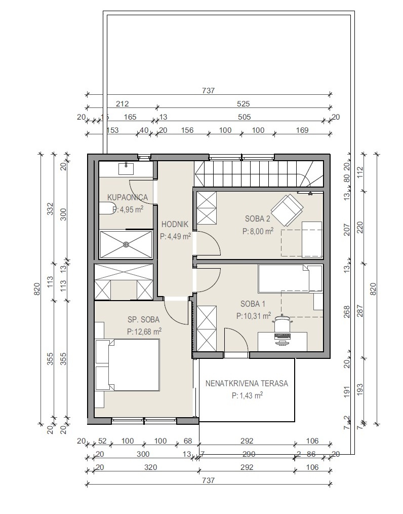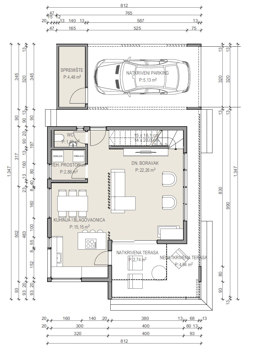 Ova moderno projektirana kuća nudi savršenu ravnotežu između dizajna i funkcionalnosti. S tri spavaće sobe, kupaonicom i dodatnim WC-om, kuhinjom s blagovaonicom te prostranim dnevnim boravkom, idealna je za obiteljski život. Dvije terase omogućuju boravak na otvorenom u svim dijelovima dana, dok natkriveni parking i dodatno spremište doprinose svakodnevnoj praktičnosti. Čiste linije, velika stakla i diskretna LED rasvjeta čine ovu kuću izrazito modernom i atraktivnom.