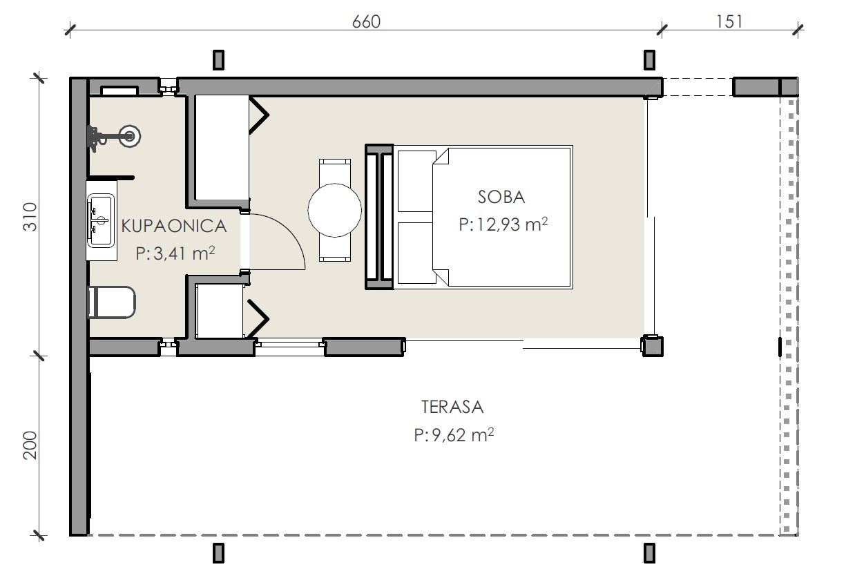 Ova kompaktna i dizajnerski upečatljiva kuća površine 21 m² idealna je za boravak uz vodu ili kao luksuzna jedinica za odmor. Uključuje jednu spavaću sobu, kupaonicu, kuhinju s blagovaonicom i dnevni boravak u otvorenom tlocrtu. Prostrana terasa s pogledom na vodu i moderna arhitektura s naglašenim linijama stvaraju dojam elegancije i privatnosti. Savršena za one koji traže minimalistički, ali sofisticiran odmor u prirodi.
