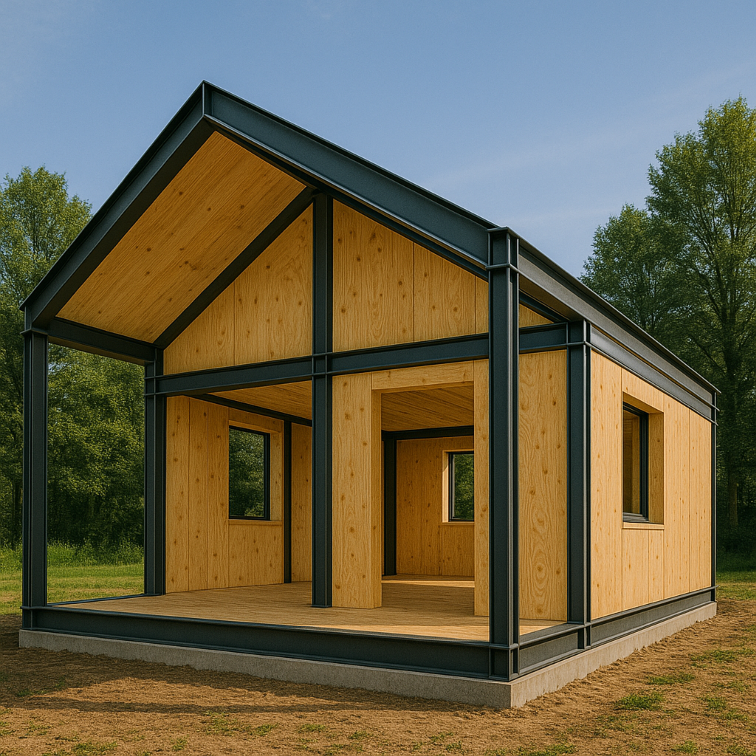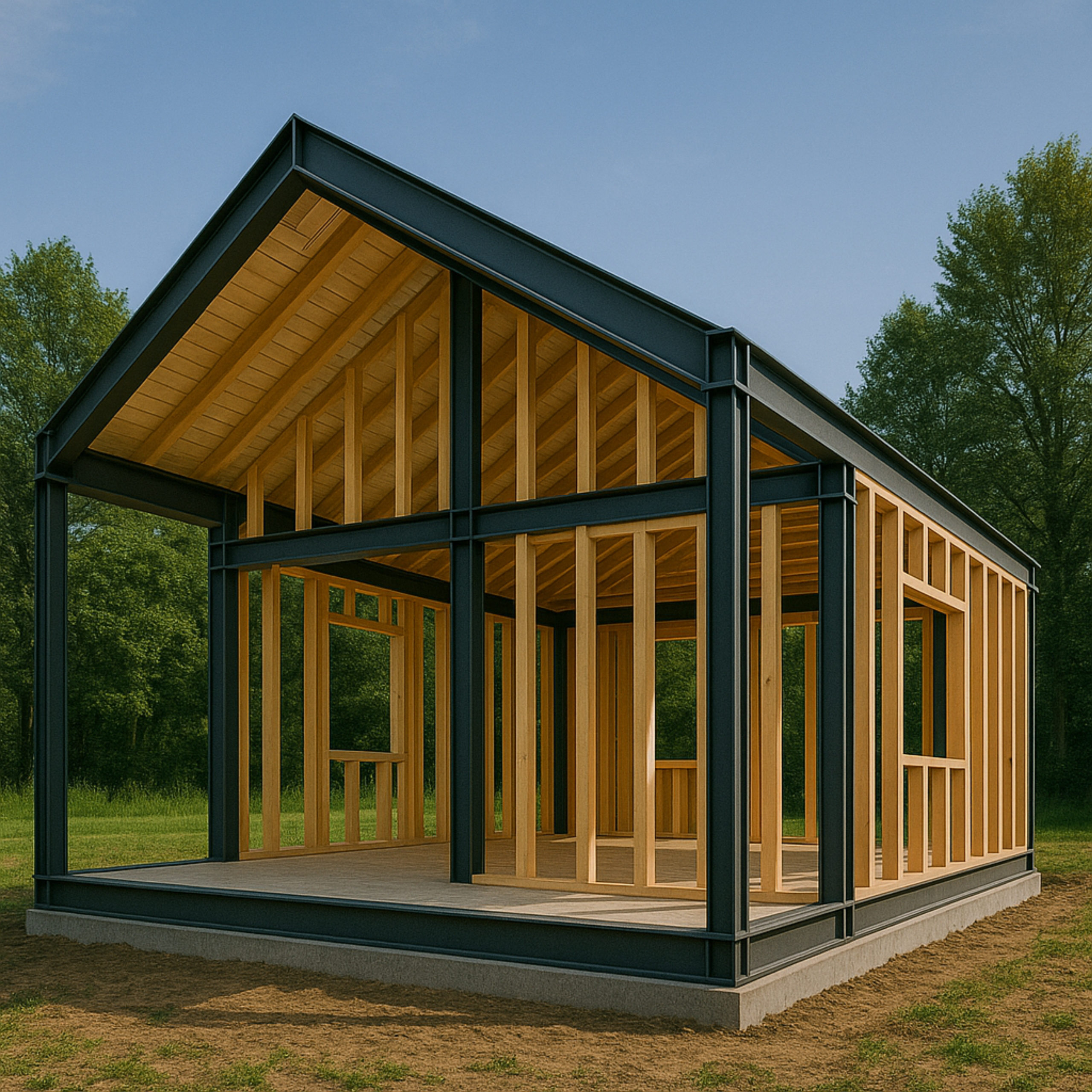 Naše modularne konstrukcije oslanjaju se na tri vrhunska materijala koji zajedno stvaraju savršenu sinergiju izdržljivosti, topline i inovacije. Čelična konstrukcija debljine 10 cm pruža izvanrednu čvrstoću i otpornost na ekstremne uvjete, dok KVH drvene grede od 10 cm donose optimalnu dimenzijsku stabilnost, prirodnu toplinu i otpornost na štetočine. CLT ispuna od 10 cm unosi revoluciju u gradnju svojim laganim, vatrootpornim slojevima koji smanjuju opterećenje temelja i štite okoliš.